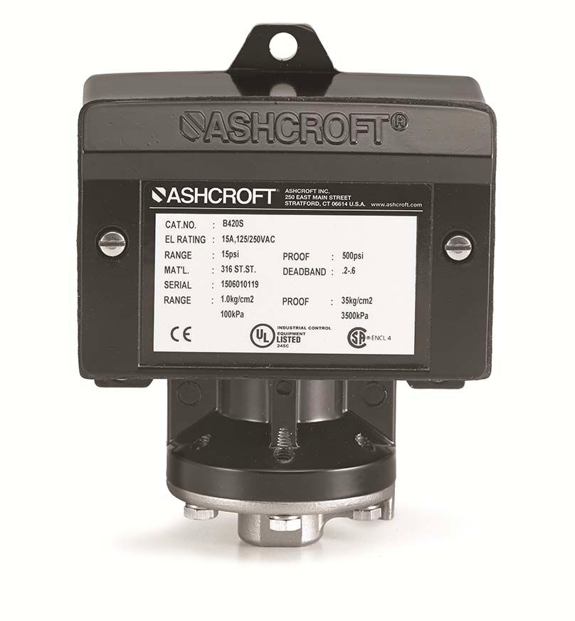 The Ashcroft® B4 pressure switch is designed for use in virtually all industrial and OEM applications. Providing reliability and long-cycle life, it is ideal for satisfying requirements for pressure control, shutdown or alarm operations. Special designs are available to meet boiler/burner, NACE and fire-safe applications.
